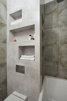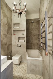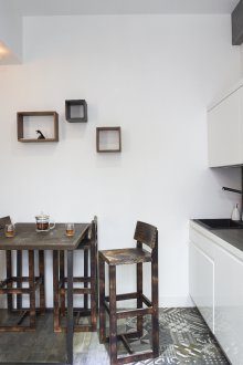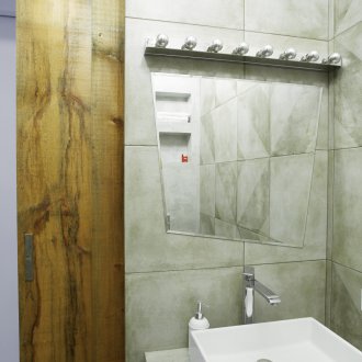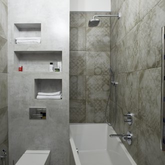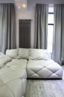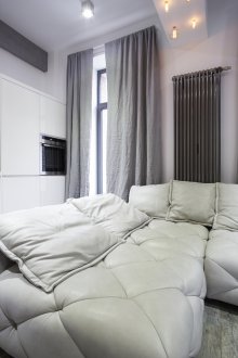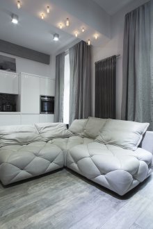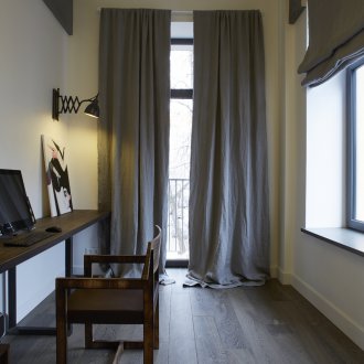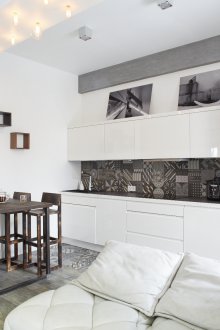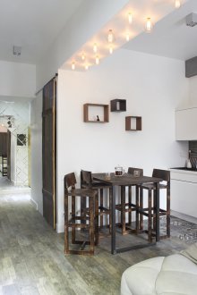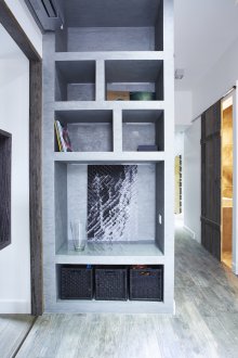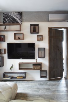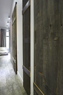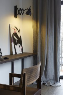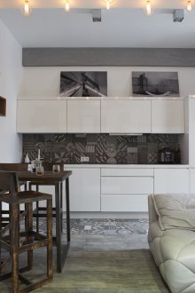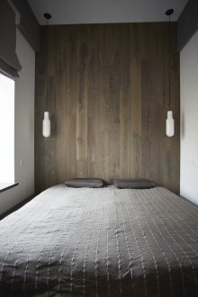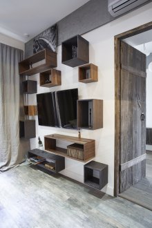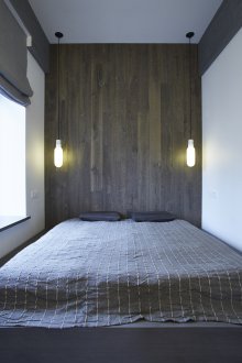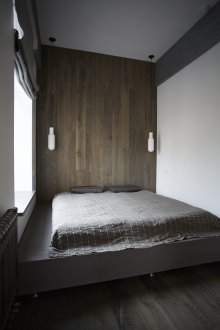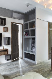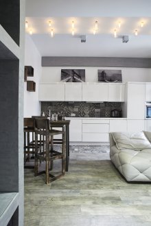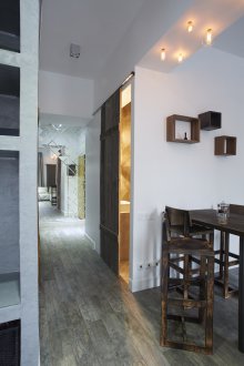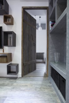 Από τις πρώτες στιγμές της συζήτησης, ερωτεύτηκα αυτό το έργο. Πολύ παρόμοια με τις απόψεις και τις ιδέες των παιδιών, η προθυμία να πειραματιστούν και το "no begge" μου δωροδόκησαν. Διακριτικό, βίαιο εσωτερικό. Ξύλο συν το βασιλιά των λουλουδιών - γκρι, σκυρόδεμα υφή και λευκό ως φόντο. Το ίδιο το σπίτι ήταν πολύ διατεταγμένο σε αυτό το στυλ - ψηλά ταβάνια των 3,40μ., Παράθυρα στο πάτωμα, πολύ κομψή διακόσμηση πρόσοψη και εσωτερικούς κοινόχρηστους χώρους. Το μόνο που παρέμεινε ήταν να διαθέσει το μικρό χώρο όσο το δυνατόν πιο λογικά και εργονομικά. Ως αποτέλεσμα, διανεμήθηκε χώρος καθιστικού με κουζίνα, μια σακκάβα κρυμμένη πίσω από μια παλιά ξύλινη πόρτα απέναντι από το μπάνιο και 2 ζώνες στο υπνοδωμάτιο - ένα υπνοδωμάτιο (ένα κρεβάτι σε όλο το πλάτος του δωματίου) και ένα χώρο εργασίας. Επίσης, κατόπιν αιτήματος των πελατών, πολλά ράφια αναλύθηκαν - κύβοι γύρω από την τηλεόραση και μια μονάδα ραφιών ενσωματωμένη στον τοίχο.
