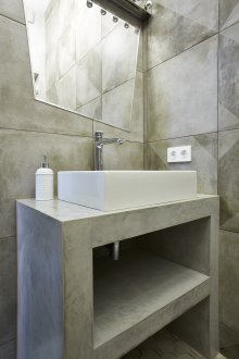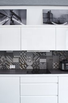 Στο c / u, εκτός από τα κεραμίδια, χρησιμοποιήσαμε ένα πολύ ενδιαφέρον υλικό, μικροσκέπασμα, το οποίο επεξεργάστηκε το ντουλάπι των κατασκευαστών με τα χέρια τους κάτω από το νεροχύτη και τα ράφια ενσωματωμένα στον τοίχο.