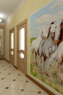 Έτσι, ένα από τα τείχη του διαδρόμου μπορεί να γίνει φωτεινό χρησιμοποιώντας έναν καμβά ή ένα τεράστιο μακρο σχέδιο, το υπόλοιπο μπορεί να διακοσμηθεί με μονόχρωμο καμβά με πιο κορεσμένη απόχρωση του ίδιου χρώματος. Διακοσμητικά πάνελ στο κάτω μέρος του τοίχου, ταπετσαρία στην κορυφή - μια άλλη ιδέα για το συνδυασμό ταπετσαρίας.