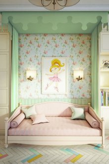 Ο σχεδιασμός ενός δωματίου για ένα κορίτσι είναι παραδοσιακά συνηθισμένο να εμφανίζεται σε ανοιχτό ροζ. Ορισμένοι κατασκευαστές επίπλων υποστηρίζουν αυτή την τάση και παράγουν ροζ καναπέδες, οι οποίοι συχνά είναι διακοσμημένοι με μανίκια, διακοσμητικά, κεντήματα, στρας και μαξιλάρια καρδιάς. Σε ένα τέτοιο κρεβάτι, το μωρό θα νιώθει σαν μια πραγματική πριγκίπισσα. Ένα θόλος νεράιδα θα βοηθήσει να δημιουργήσετε ένα θόλο. Για ένα πολύχρωμο θόλο, το παιδί όχι μόνο θα κοιμάται άνετα, αλλά και θα διασκεδάσει παίζοντας.